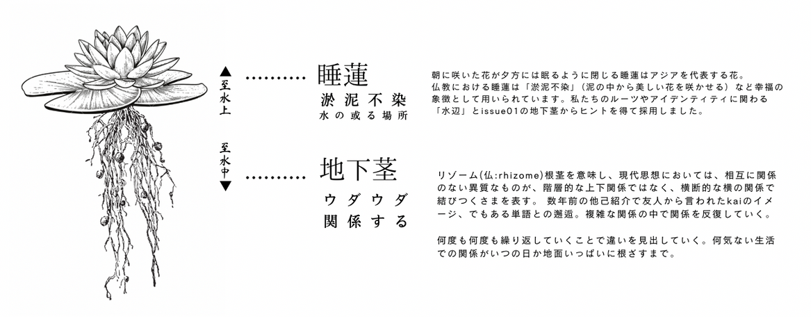 The motif and cover of the first issue is a rhizome. We found the meaning of the construction of transversal relationships and solidarity in the non-class-like appearance of the rhizome in contrast to the tree. In addition to the concept of the rhizome, we chose this flower because it is related to our roots (watering hole), and because water lilies are used not only in religion but also in songs, stories, and textiles in various regions of East Asia. The flower also signifies the intersection of the meaning of flowers blooming out of mud in Buddhism, the rare characteristics of aquatic plants, and our own minorities.