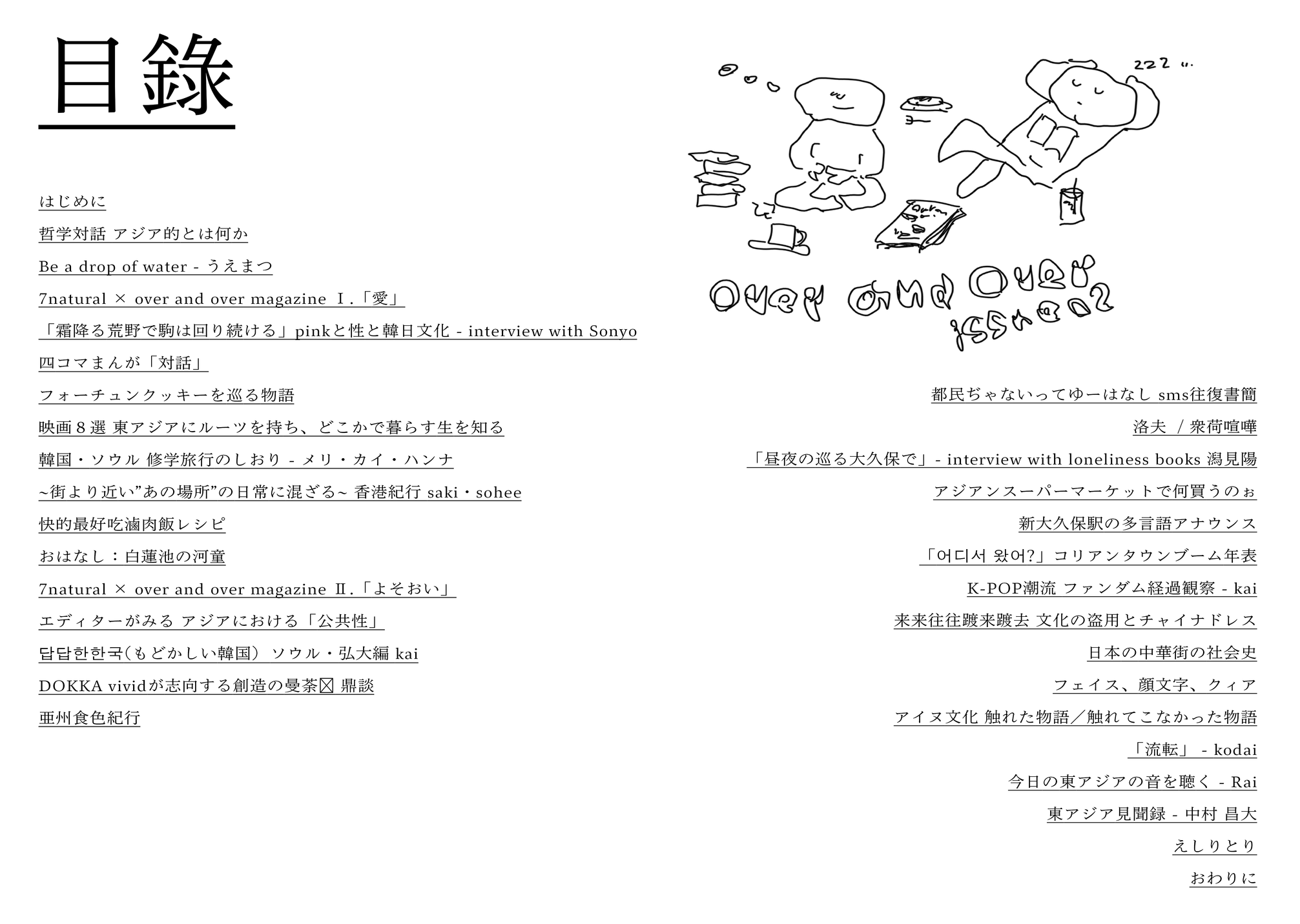 日本の政治は戦後からほとんど変わらずにここまでやってきた。何度も何度も失敗をし、歴史修正やレイシズムに加担することでさえも。そうしたものにピリオドを打つこと、同時に我々が見過ごしがちな日々毎日の暮らしという繰り返すものへフォーカスすること。アイデンティティや文脈を持ったものたちに目を向け、消費だけでないカルチャーの捉え方をまなざすこと。複合的な事物の編纂が「over and over」です。